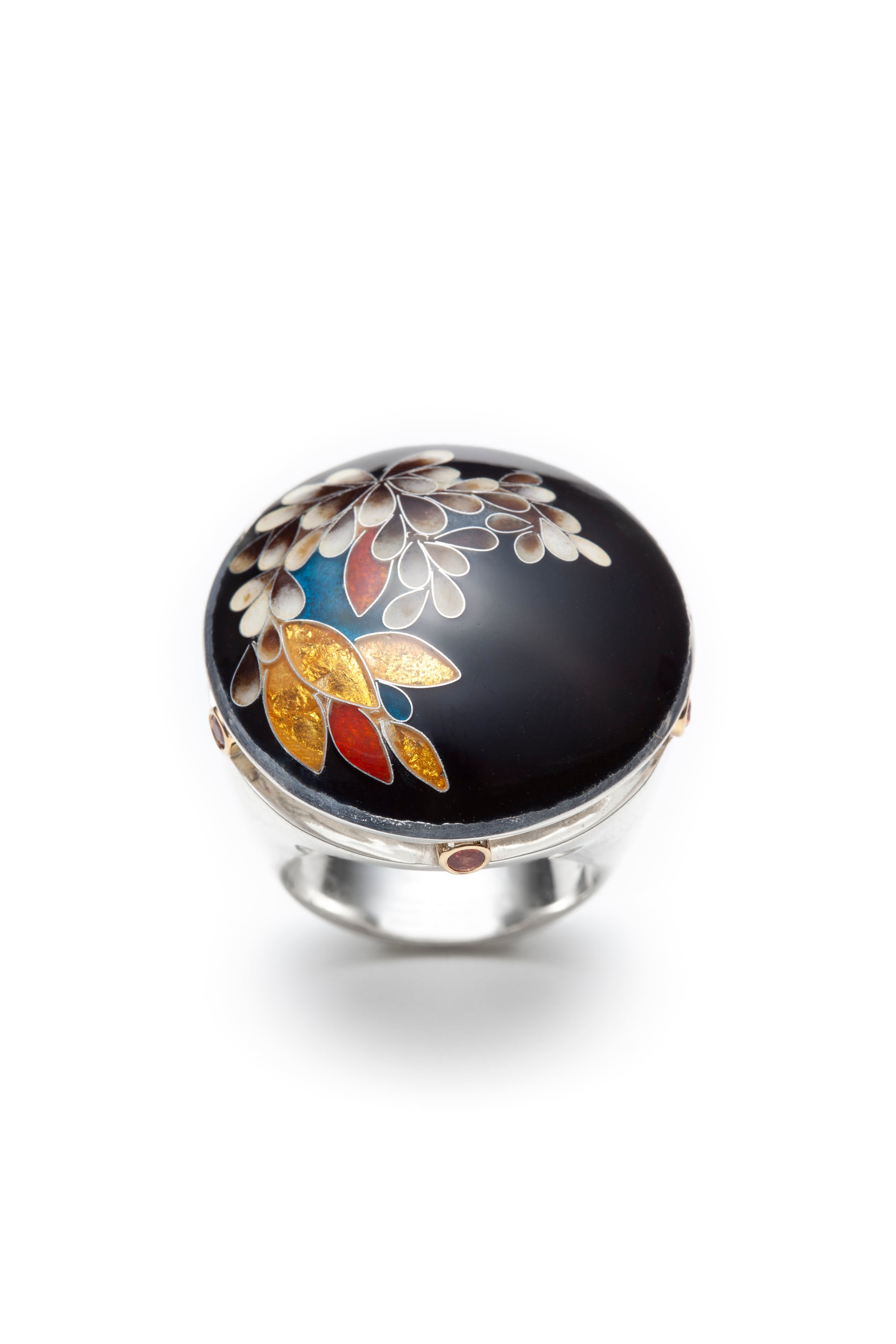 Fine silver (999) ring adorned with cloisonne enamel design, inspired from blooming flowers. 24K gold leafs and fine silver foil provide accent to the ring. Five orange saphires set in 18K gold carry the cupola.