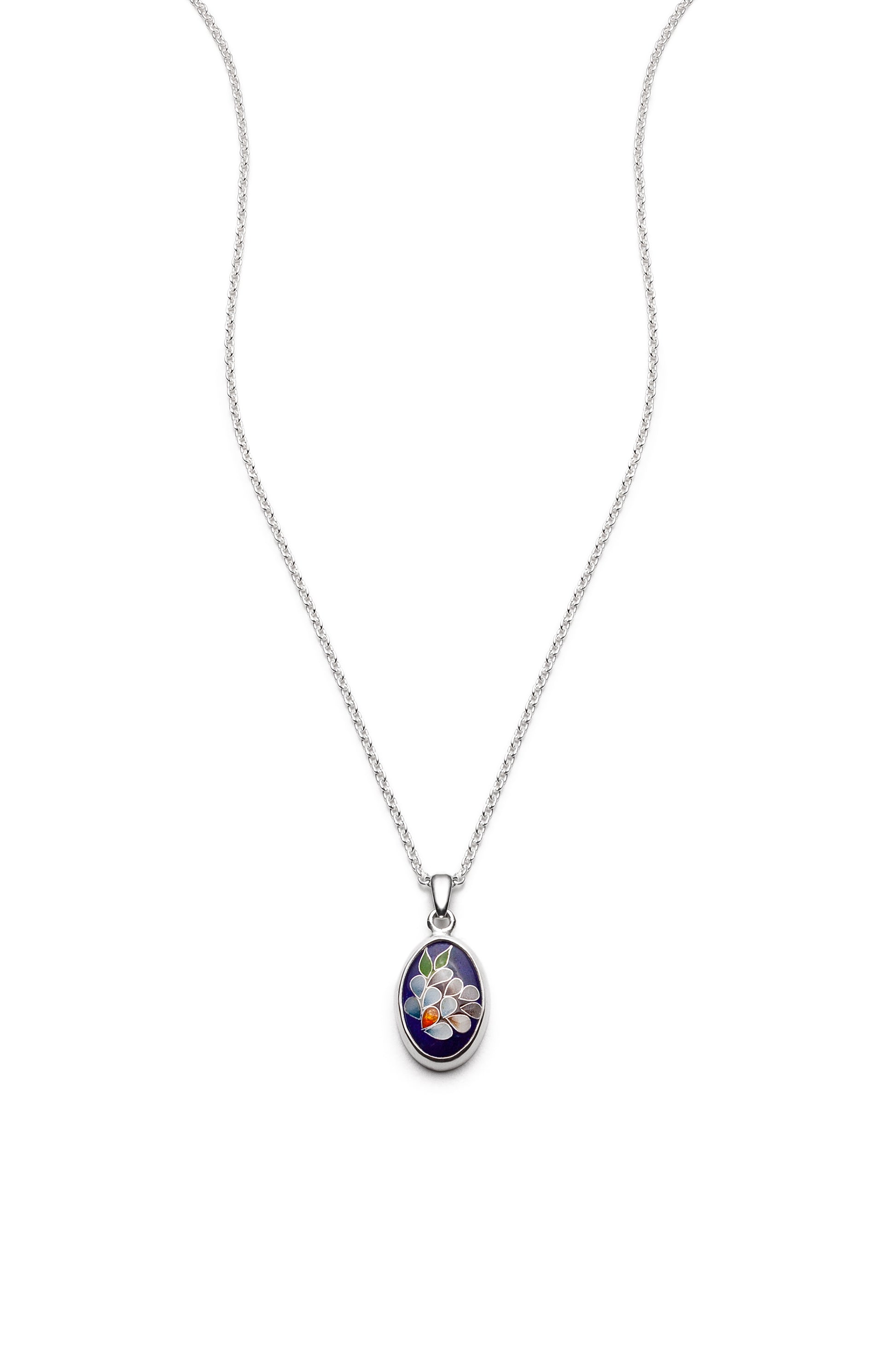 The pendant is made with a traditional cloisonné enamelling technique with the use of 24k gold foils to add depth and lustre to the piece. The pendant is made of sterling silver.